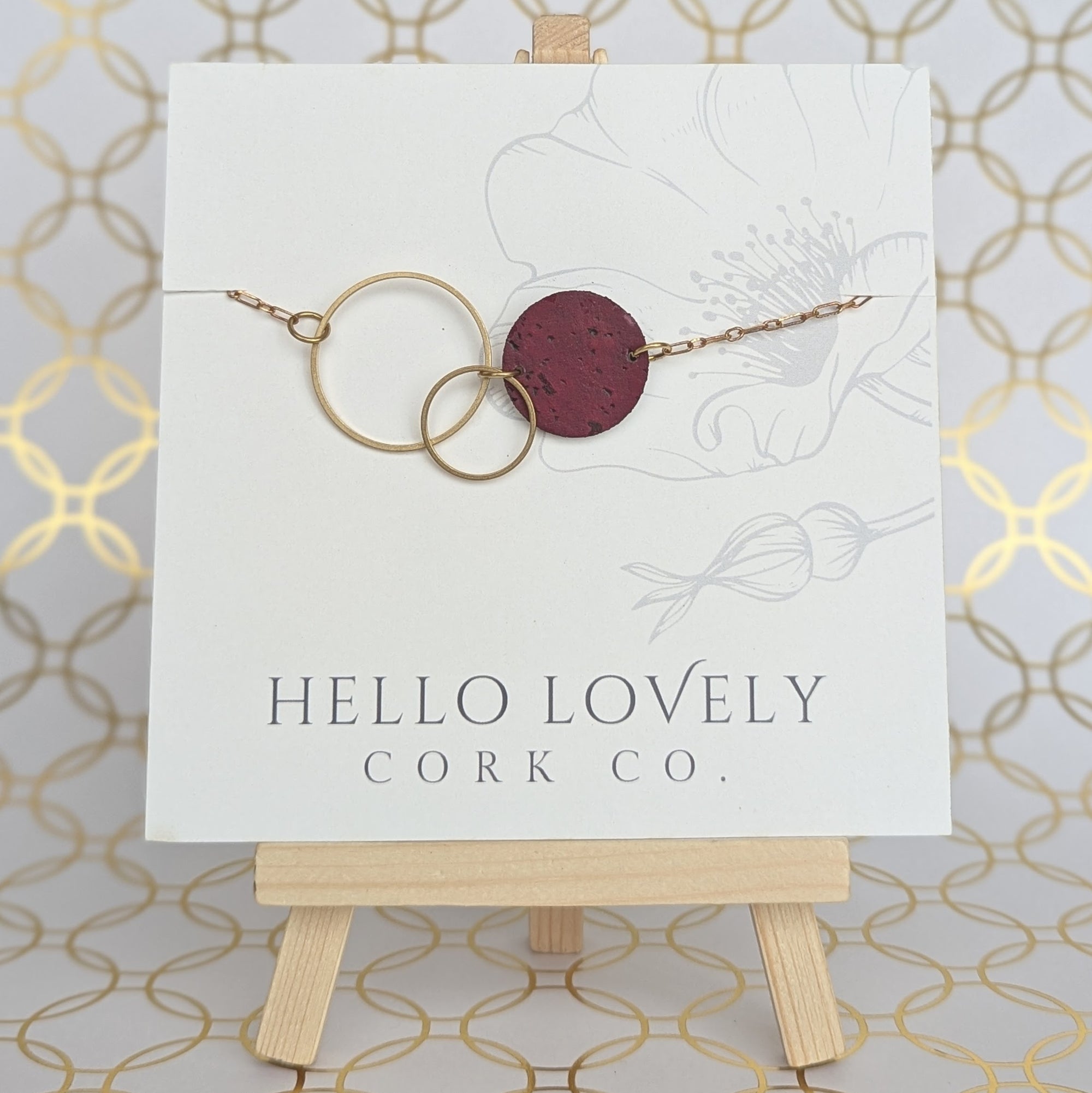 Brass Circle Necklace - Embroidered Hexagons and Wine Red