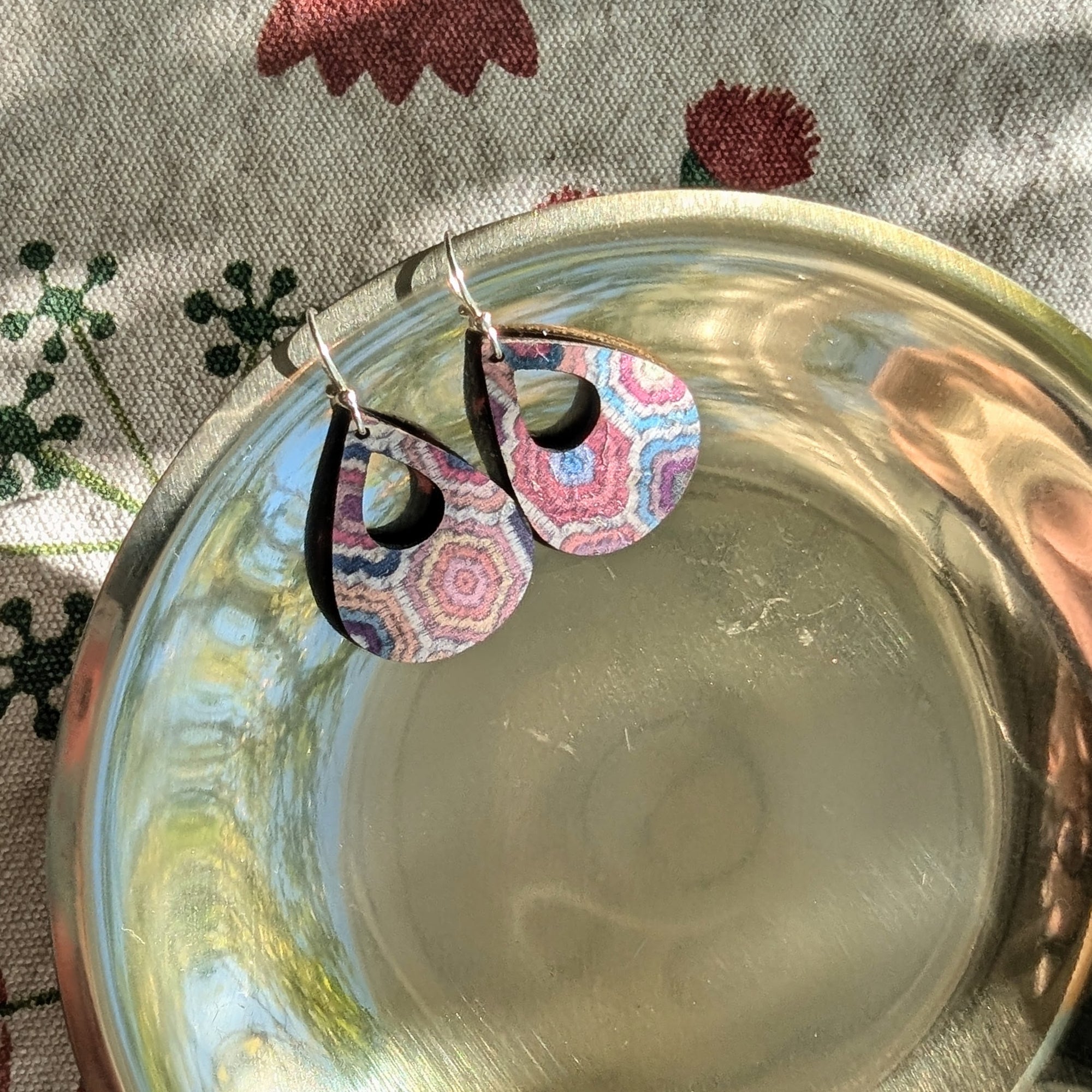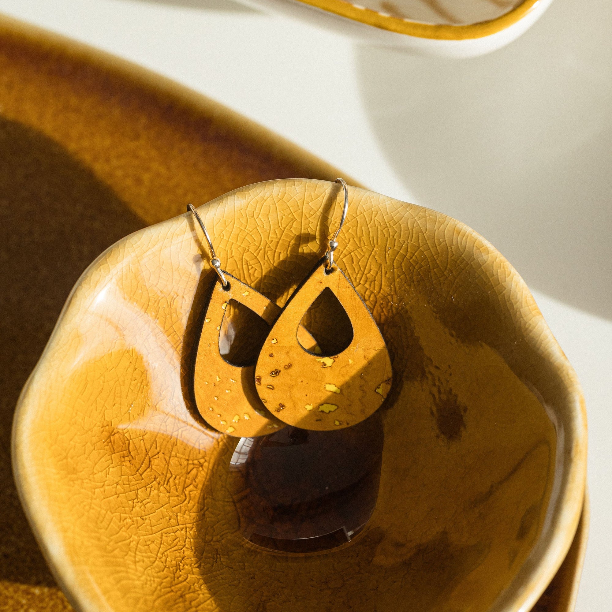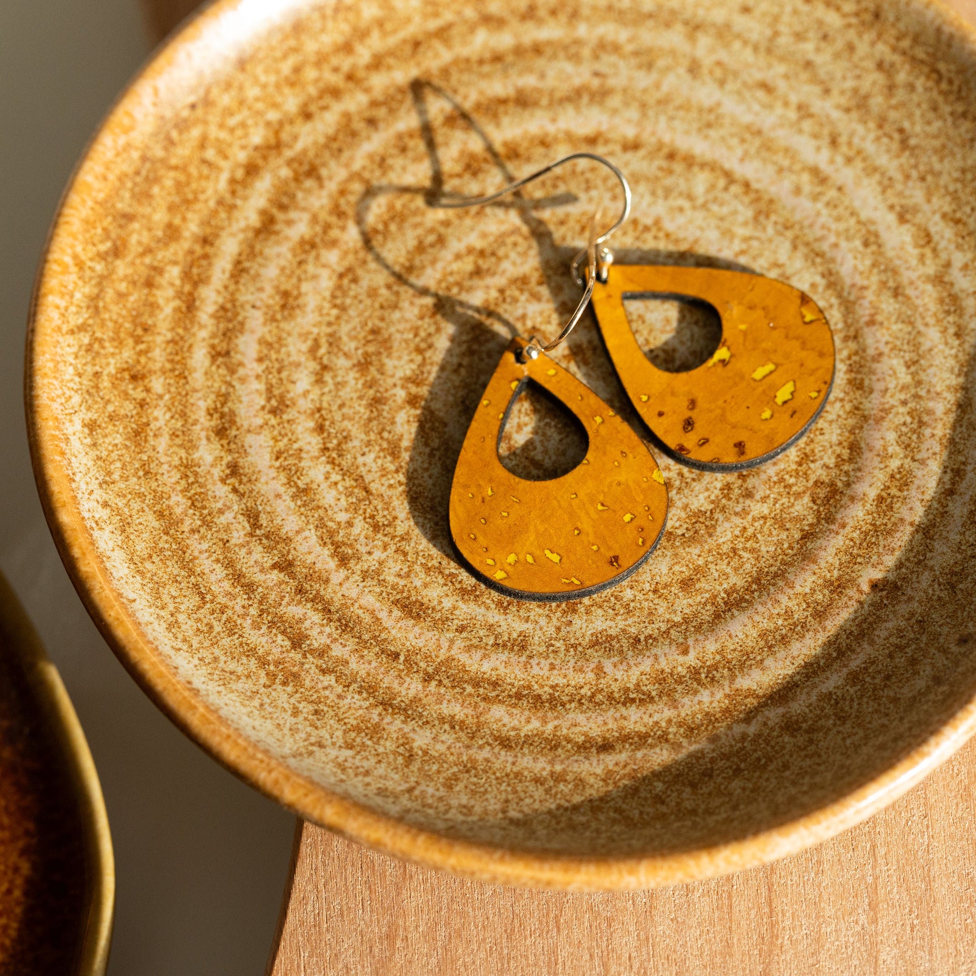Embroidered Hexagons Cork Earrings - Small Teardrop