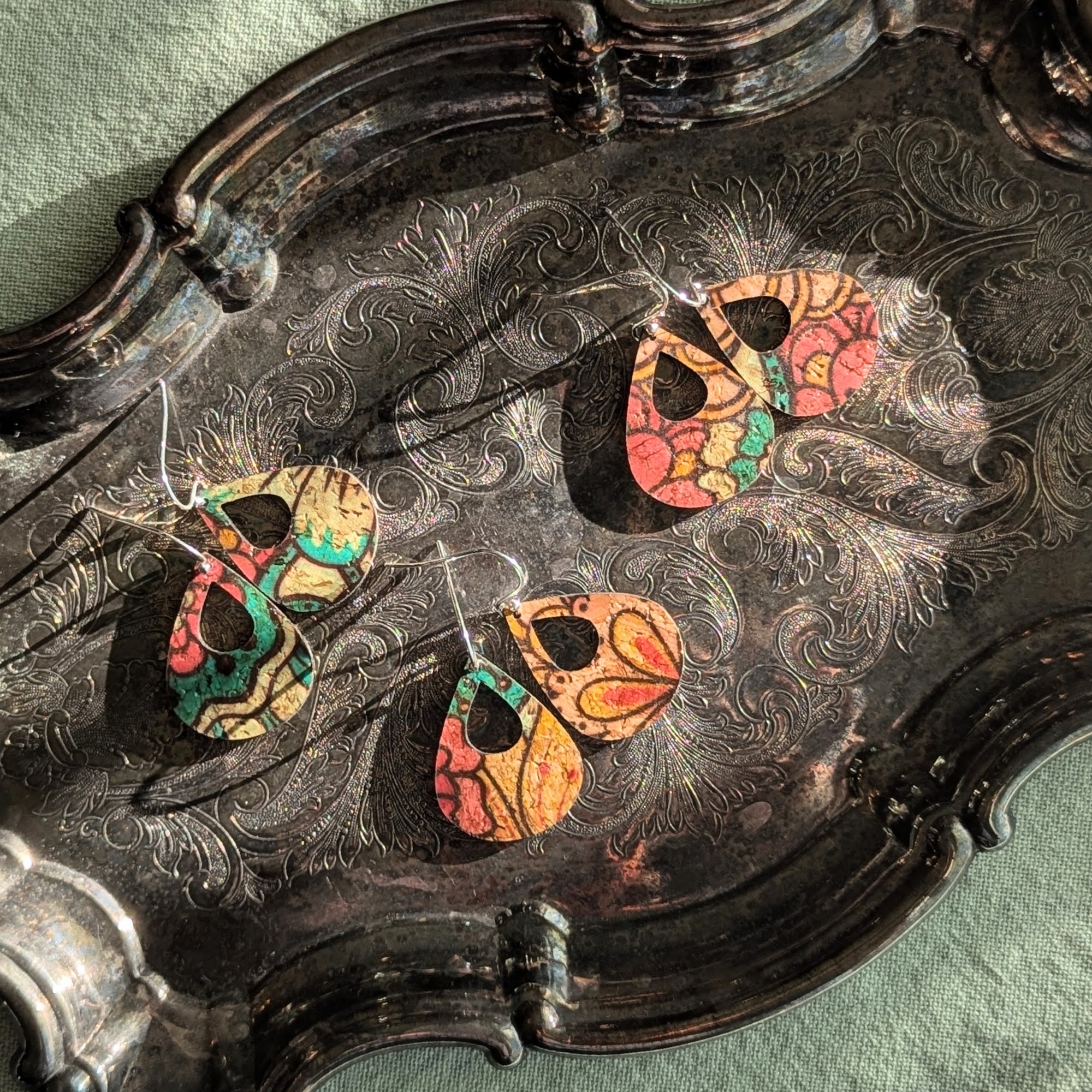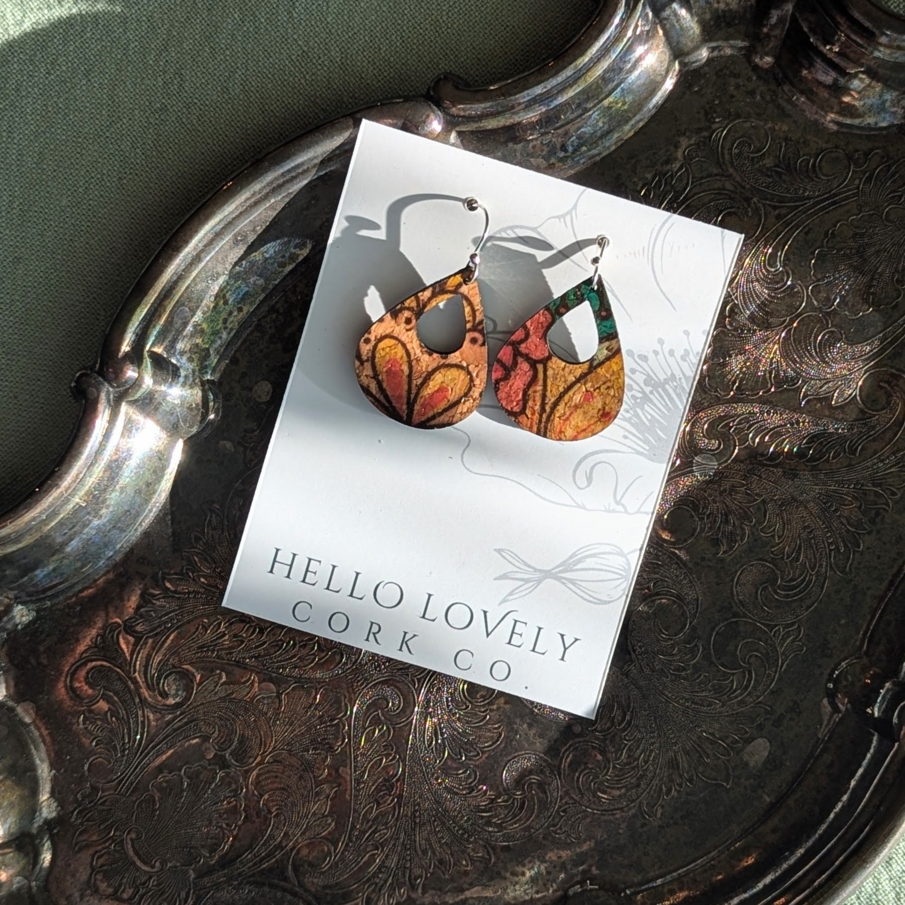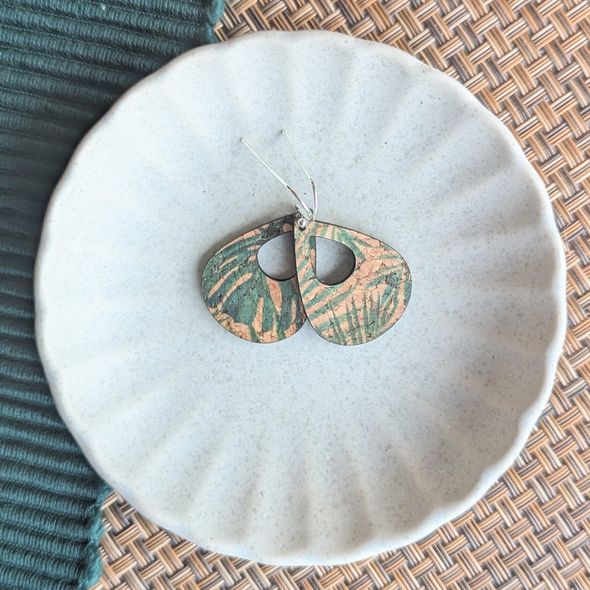 Olive and Teal Floral Cork Earrings - Small Teardrop