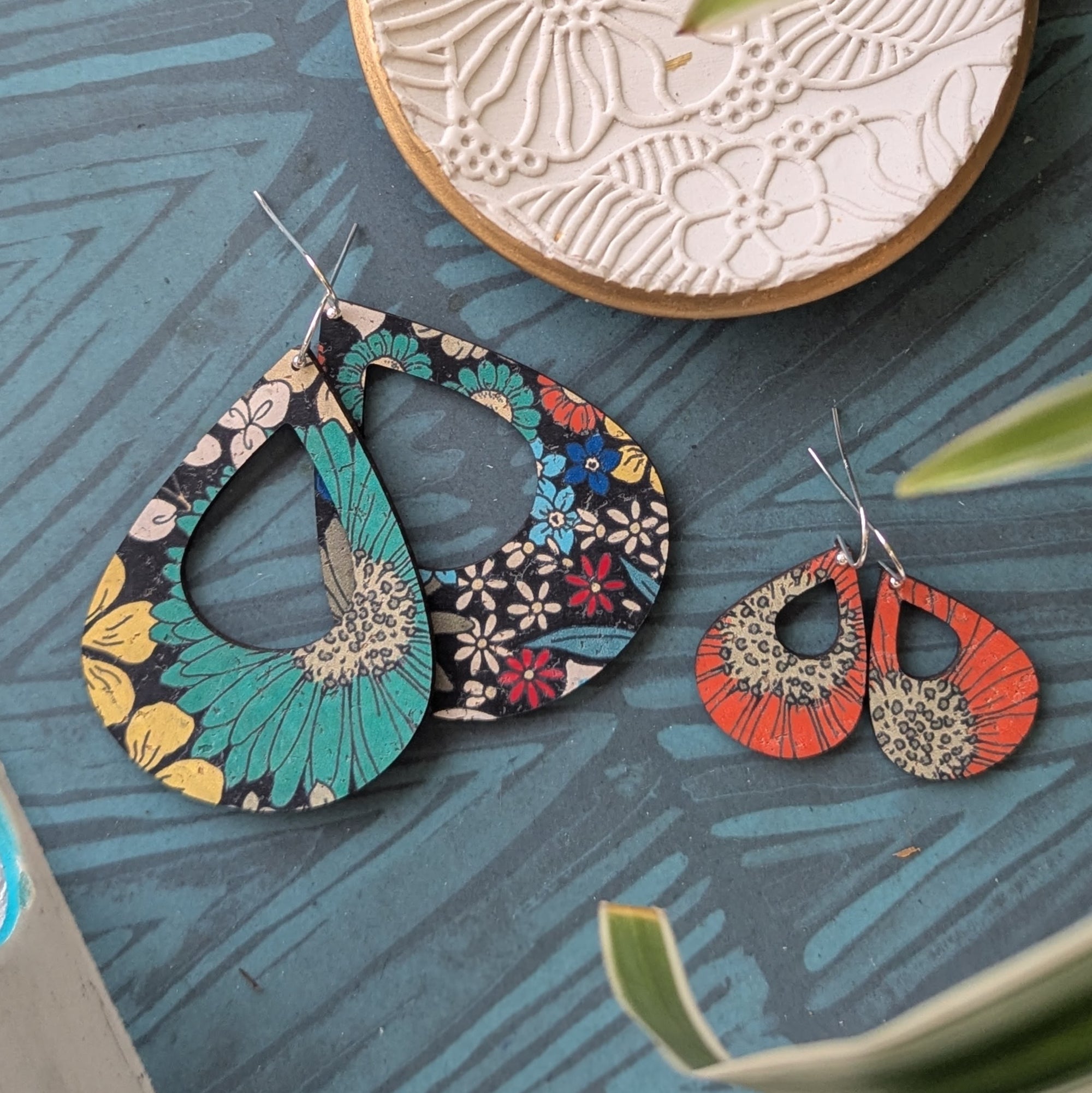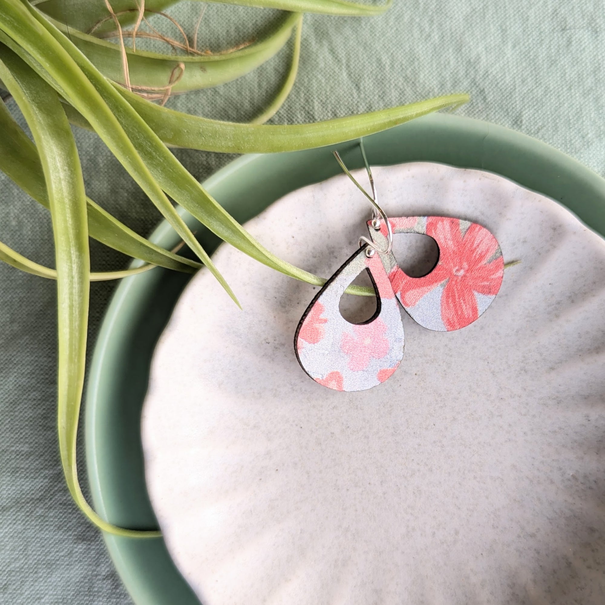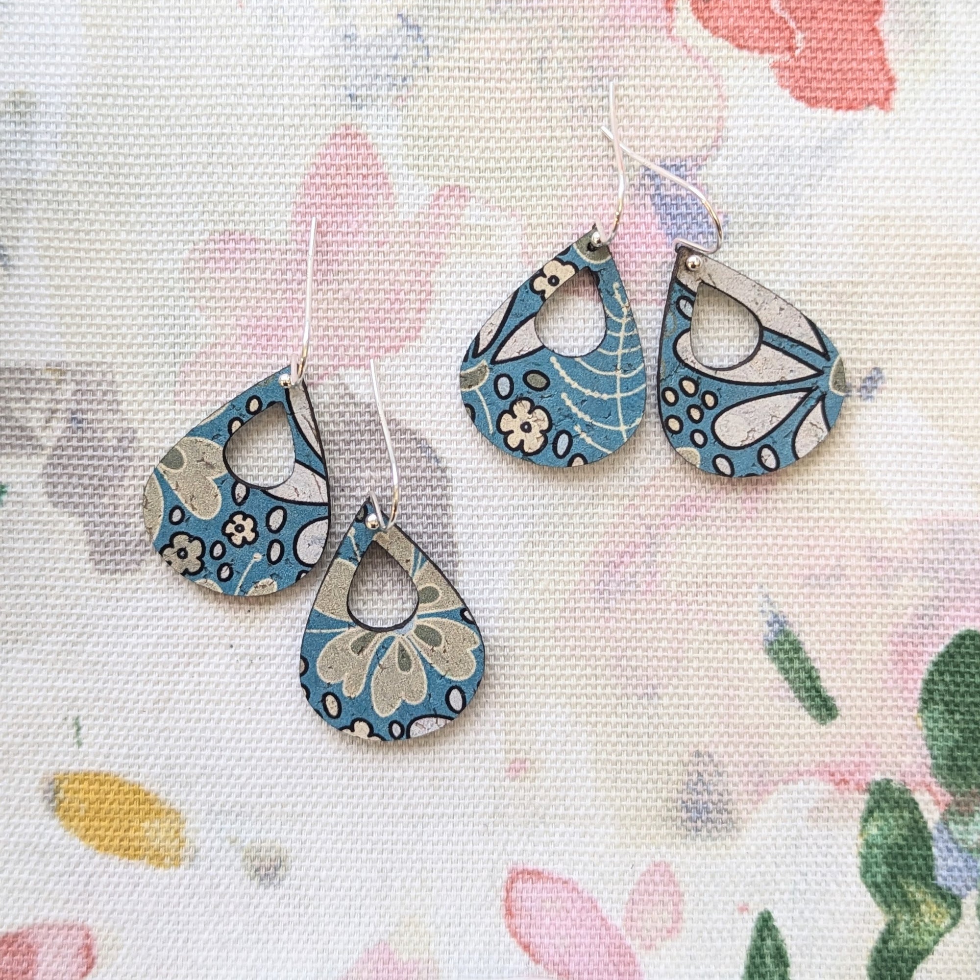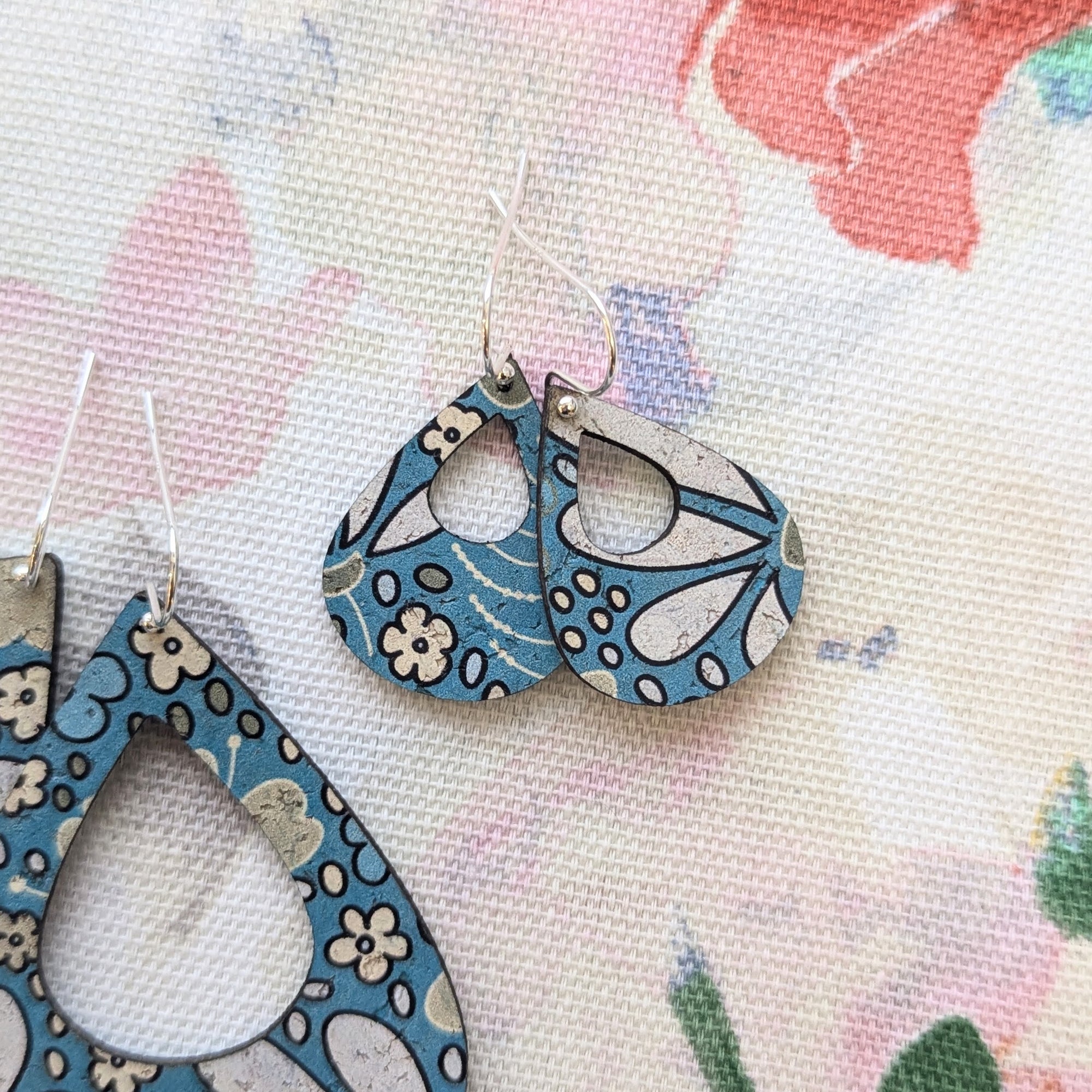 Spring Floral on Blue Cork Earrings - Small Teardrop