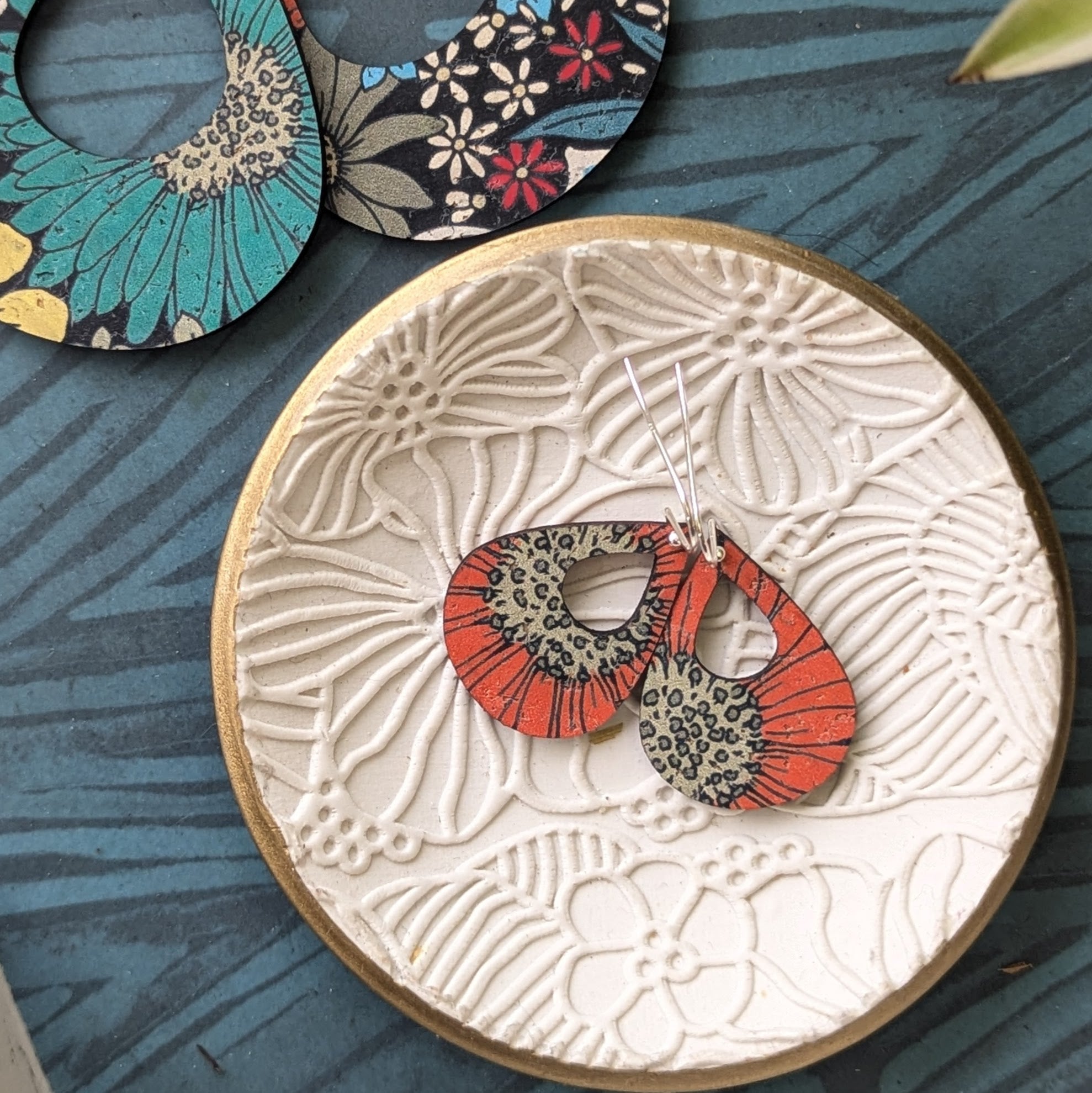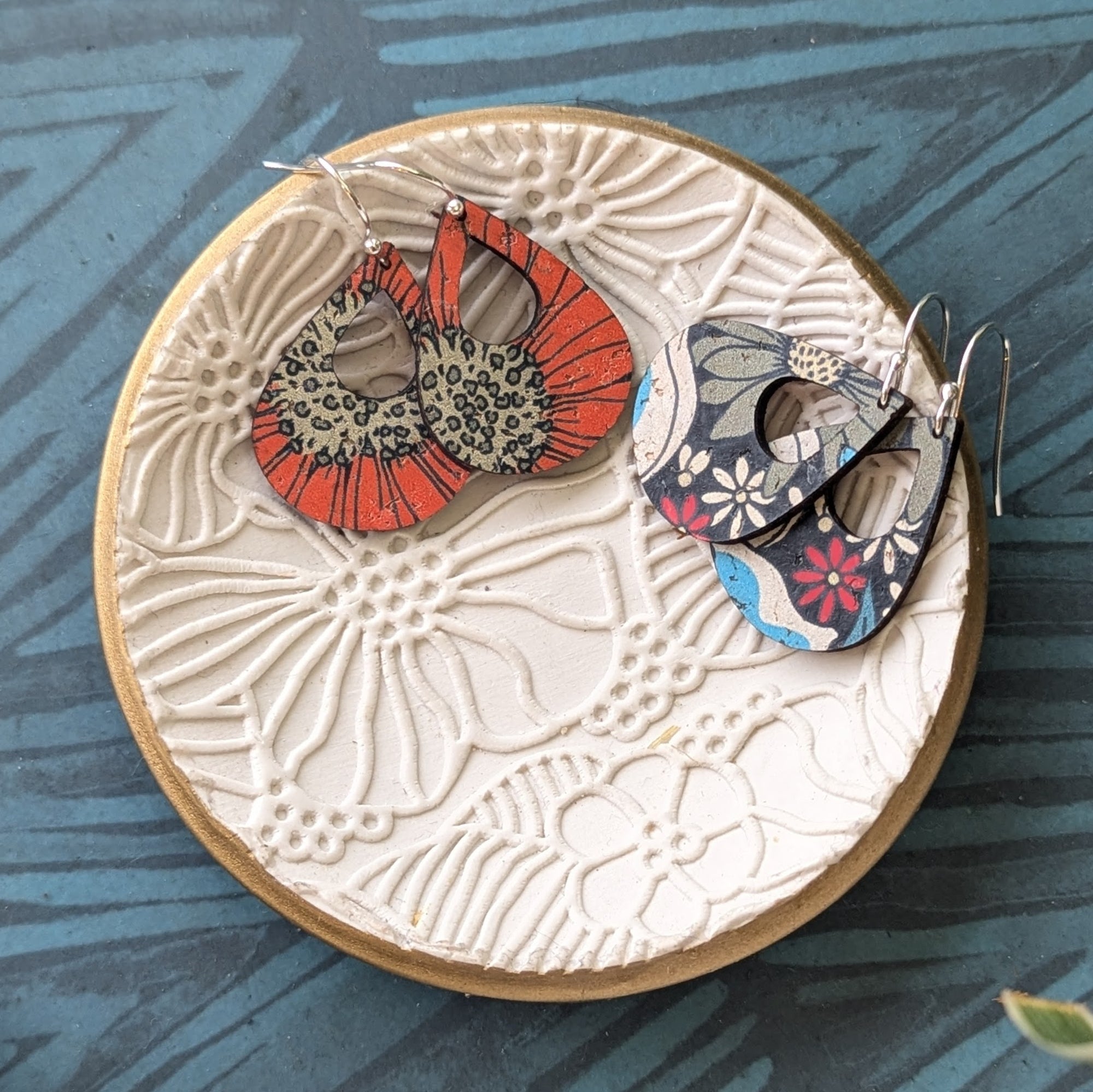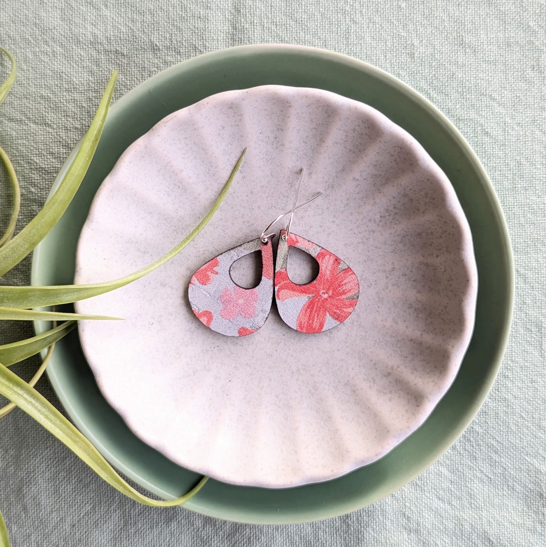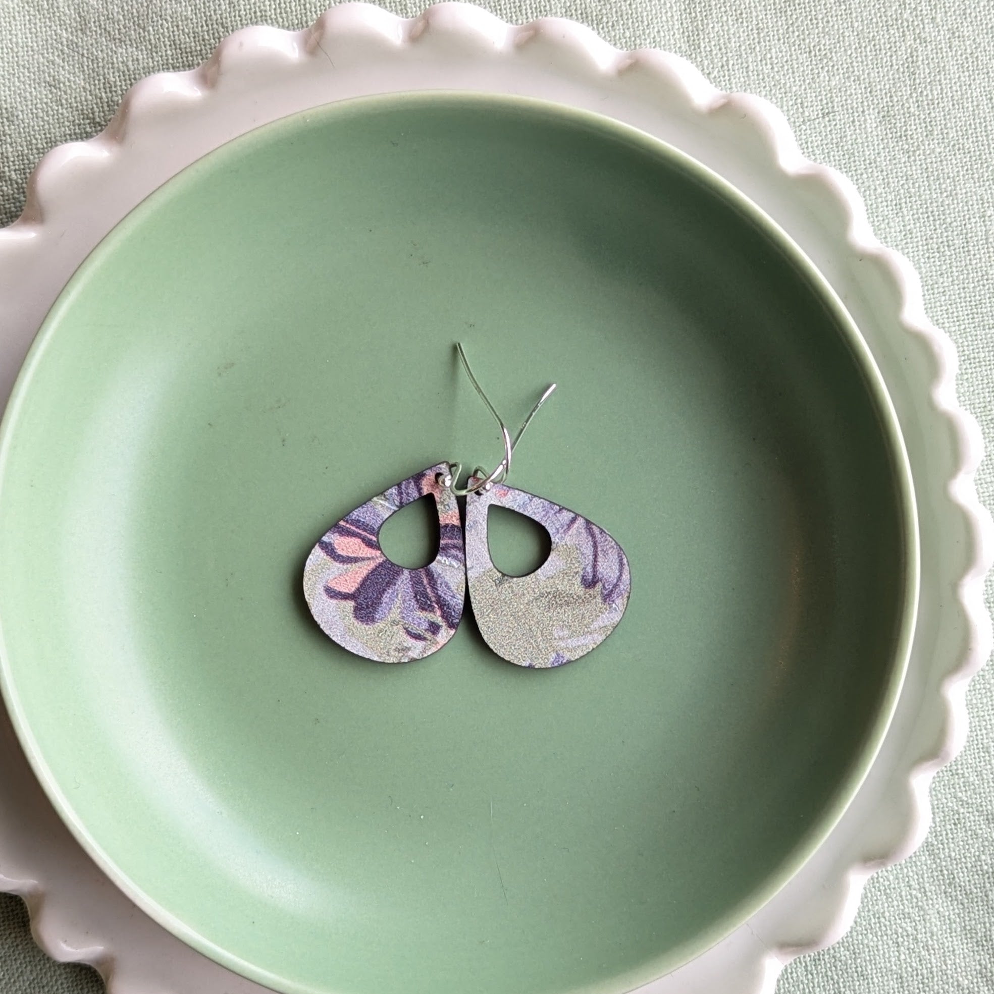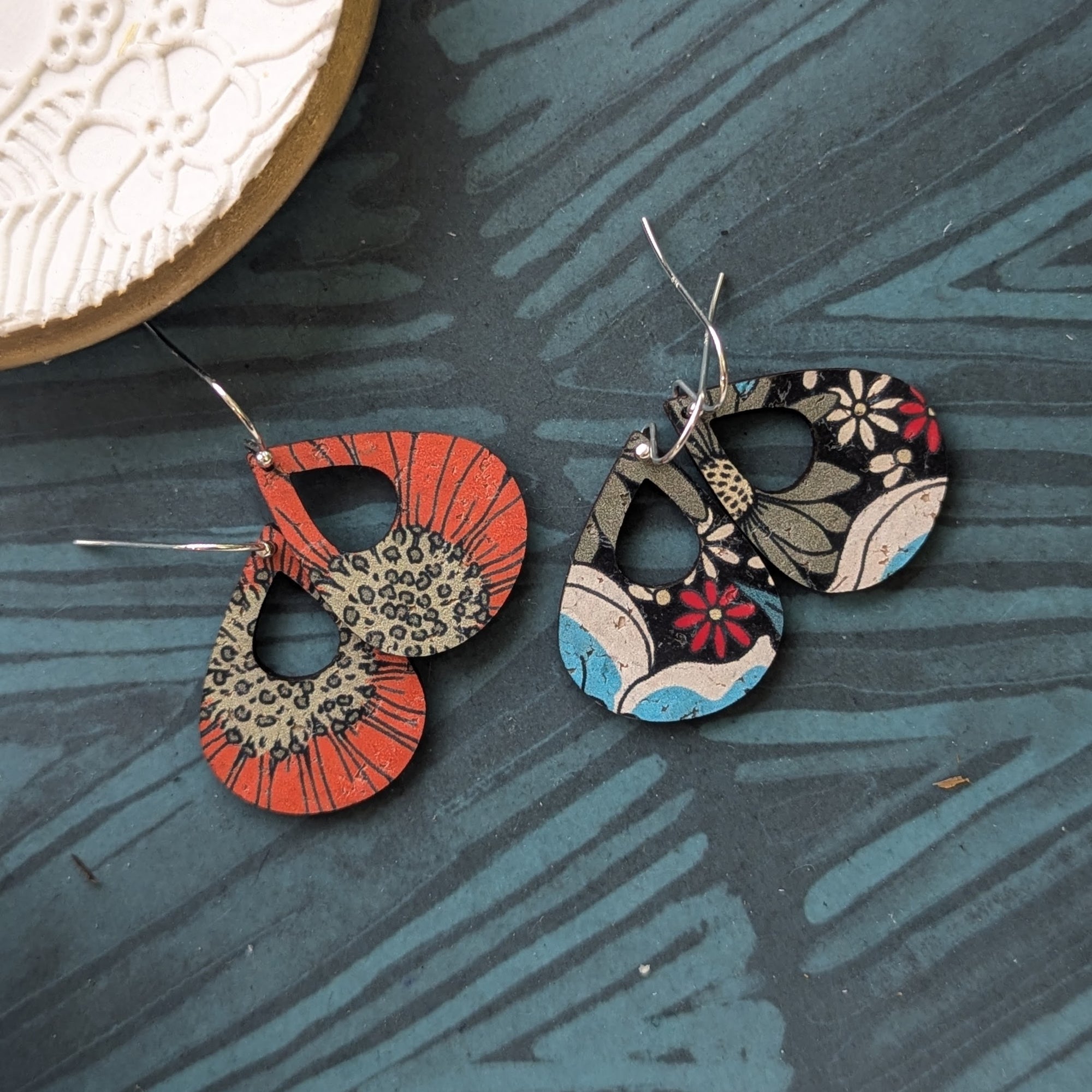 Spring Floral on Blue Cork Earrings - Small Teardrop