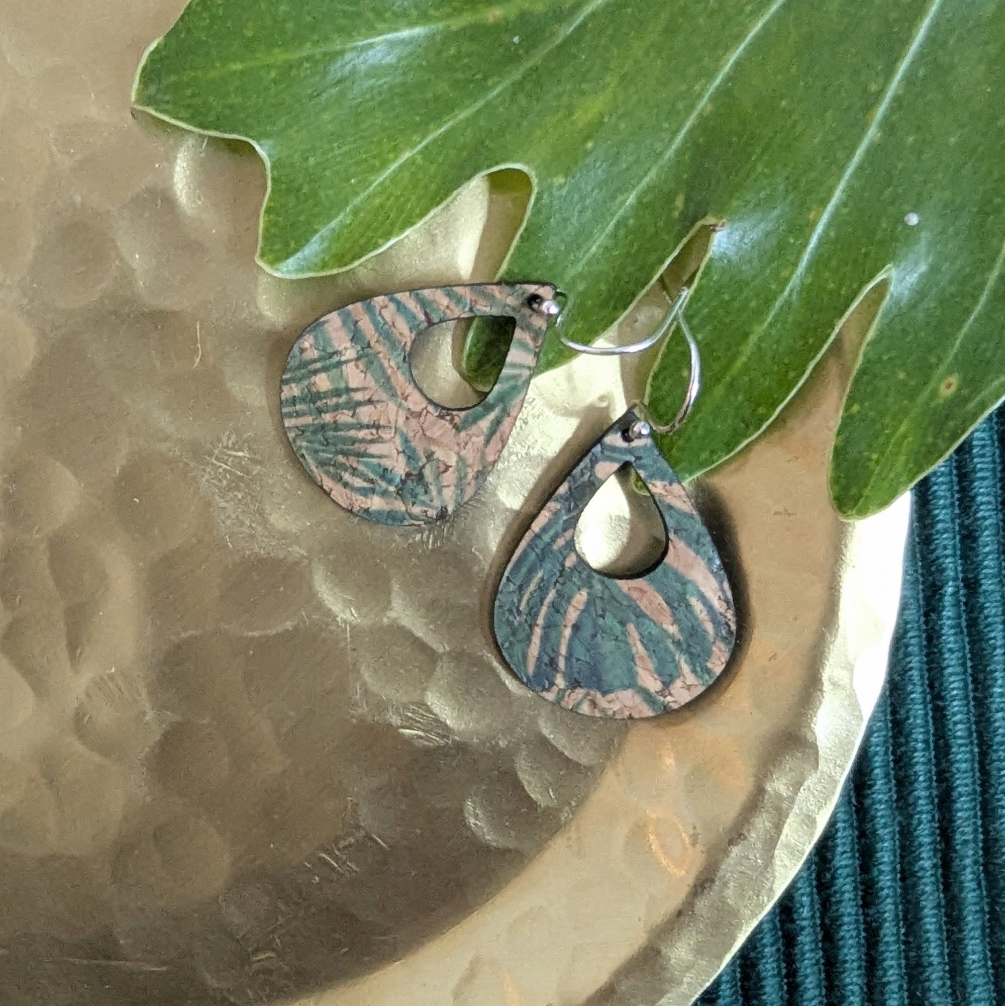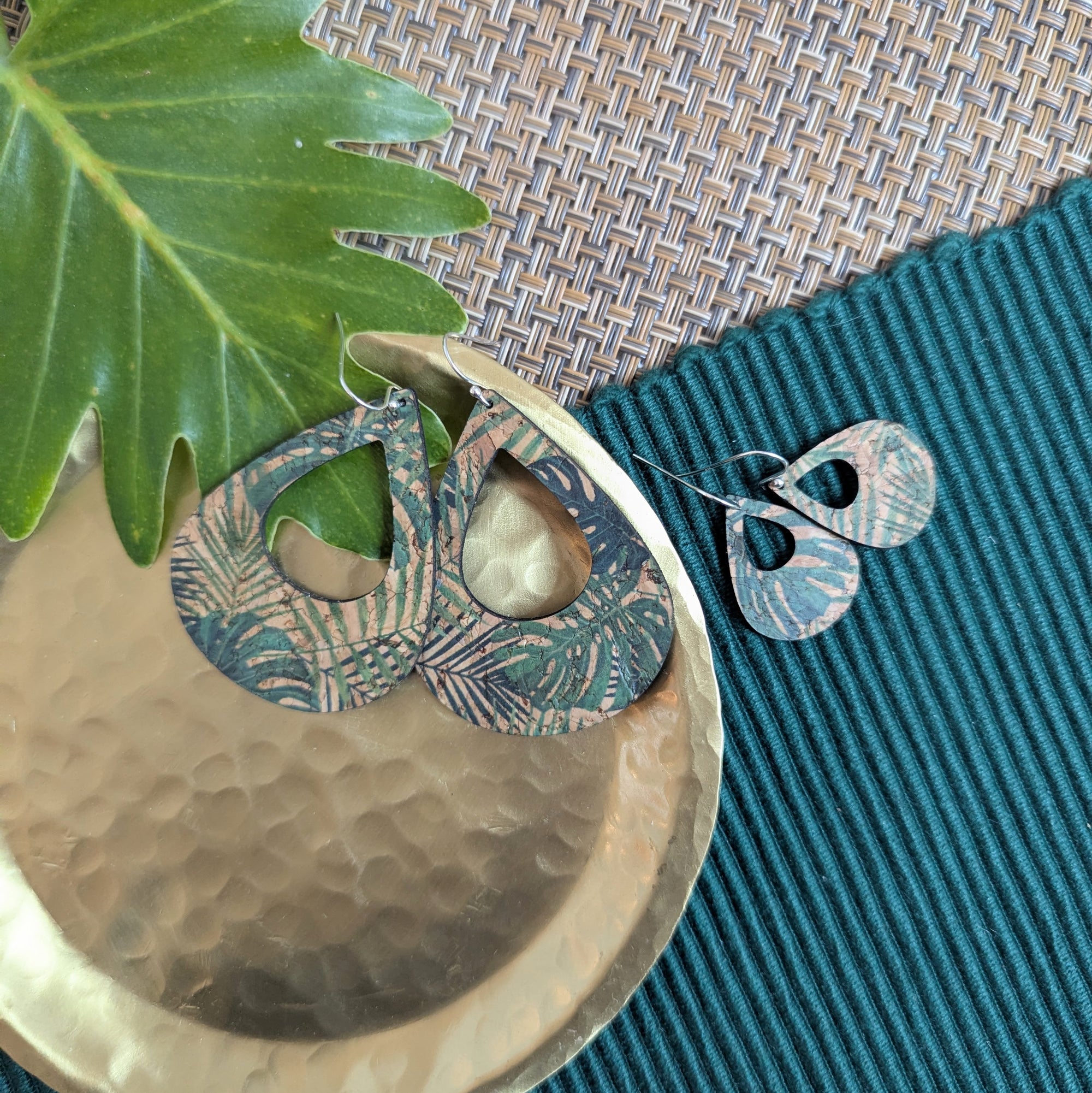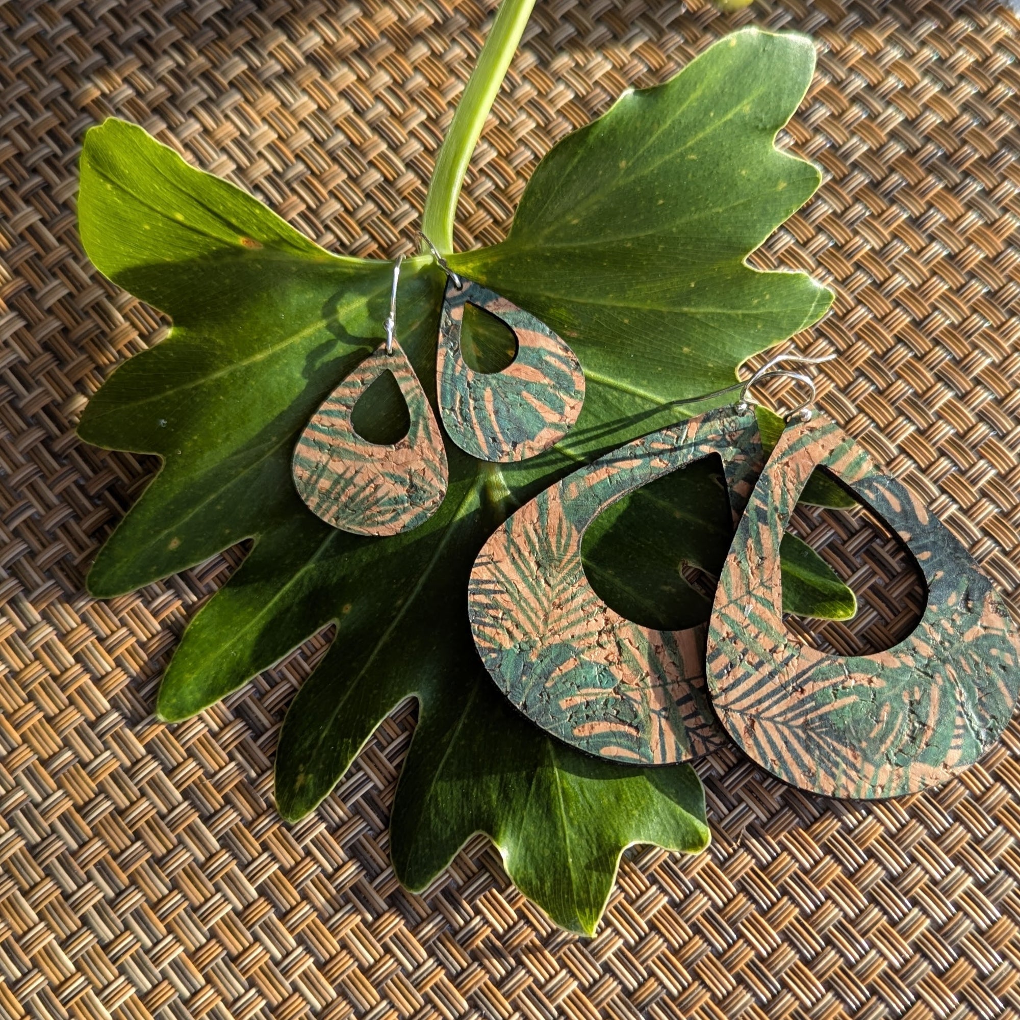 Green and Fuchsia Leaves Cork Earrings - Small Teardrop
