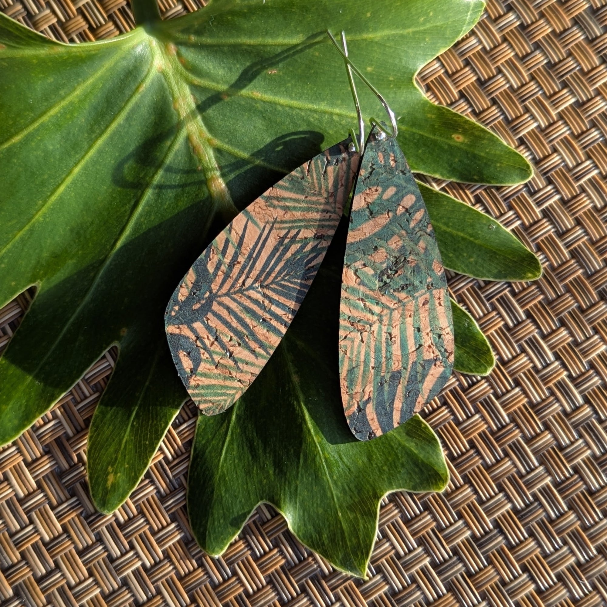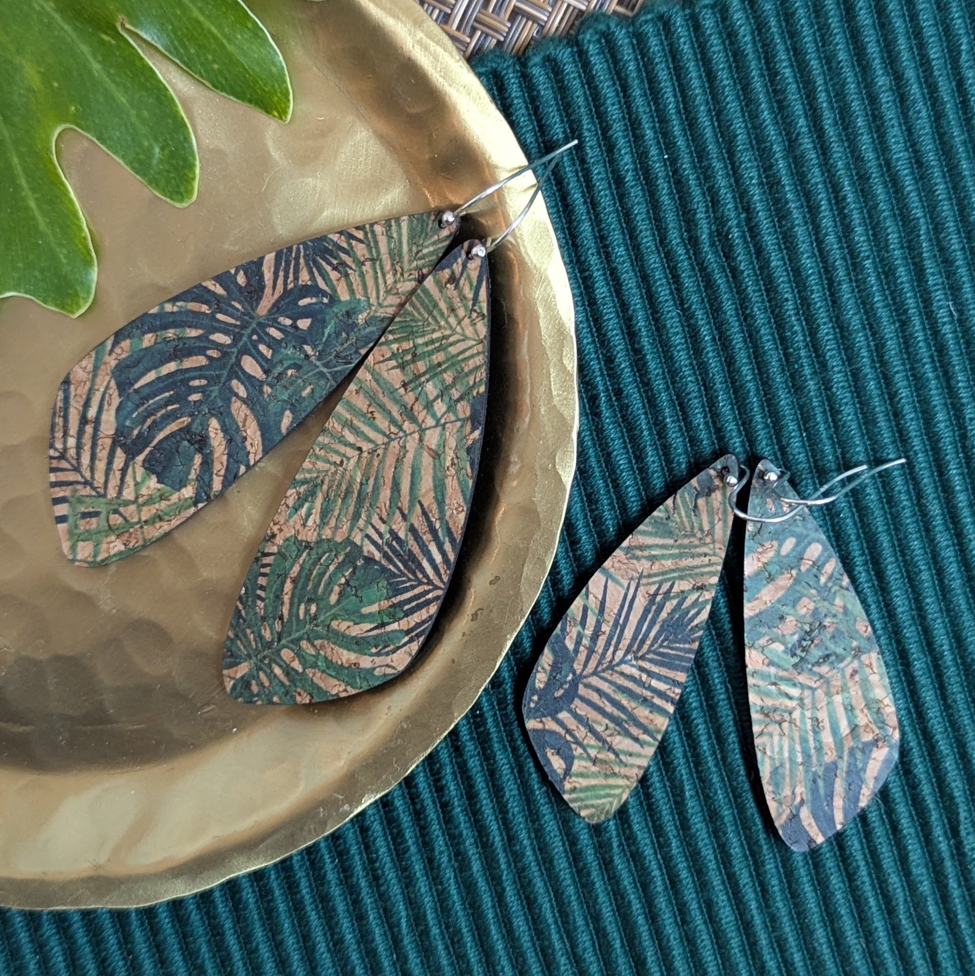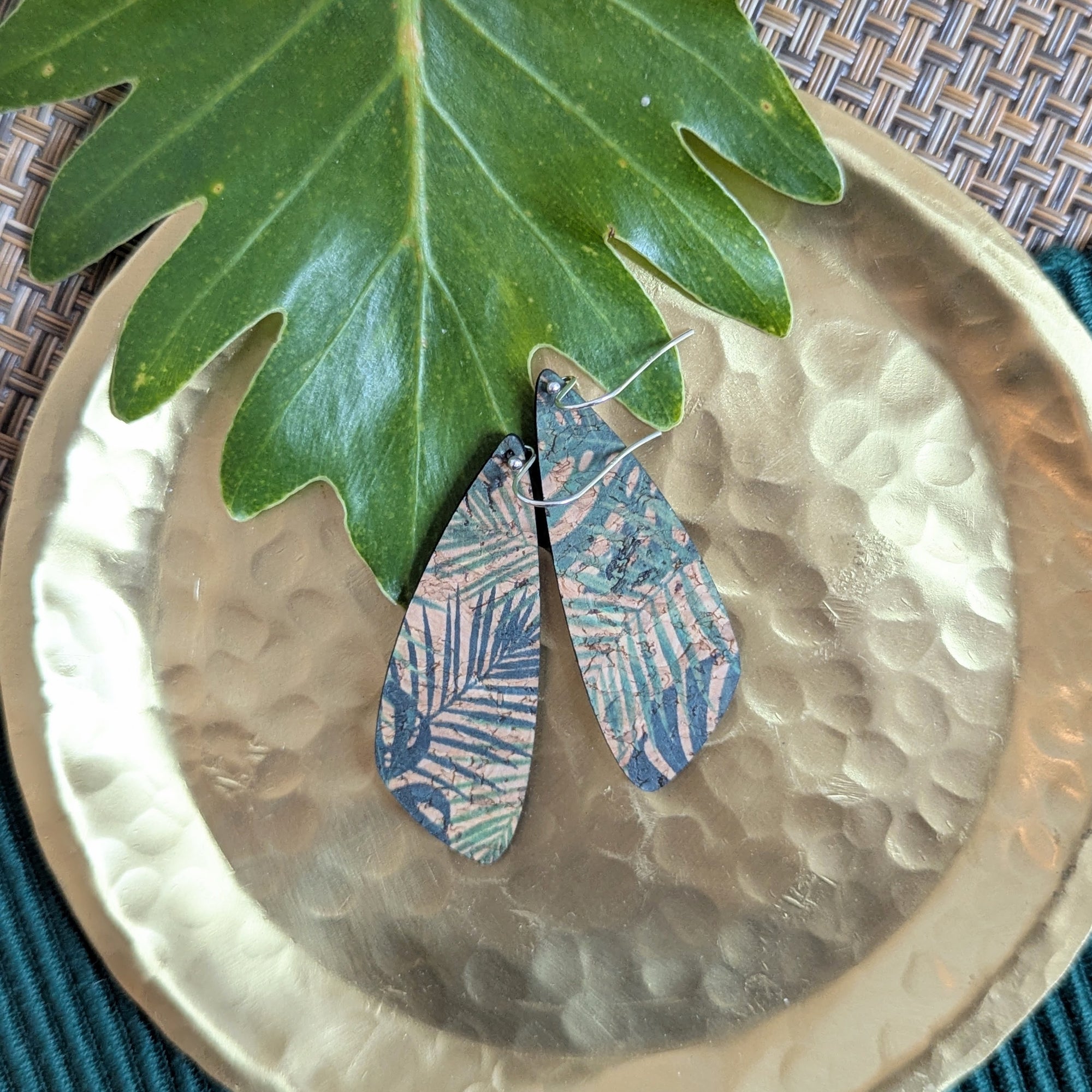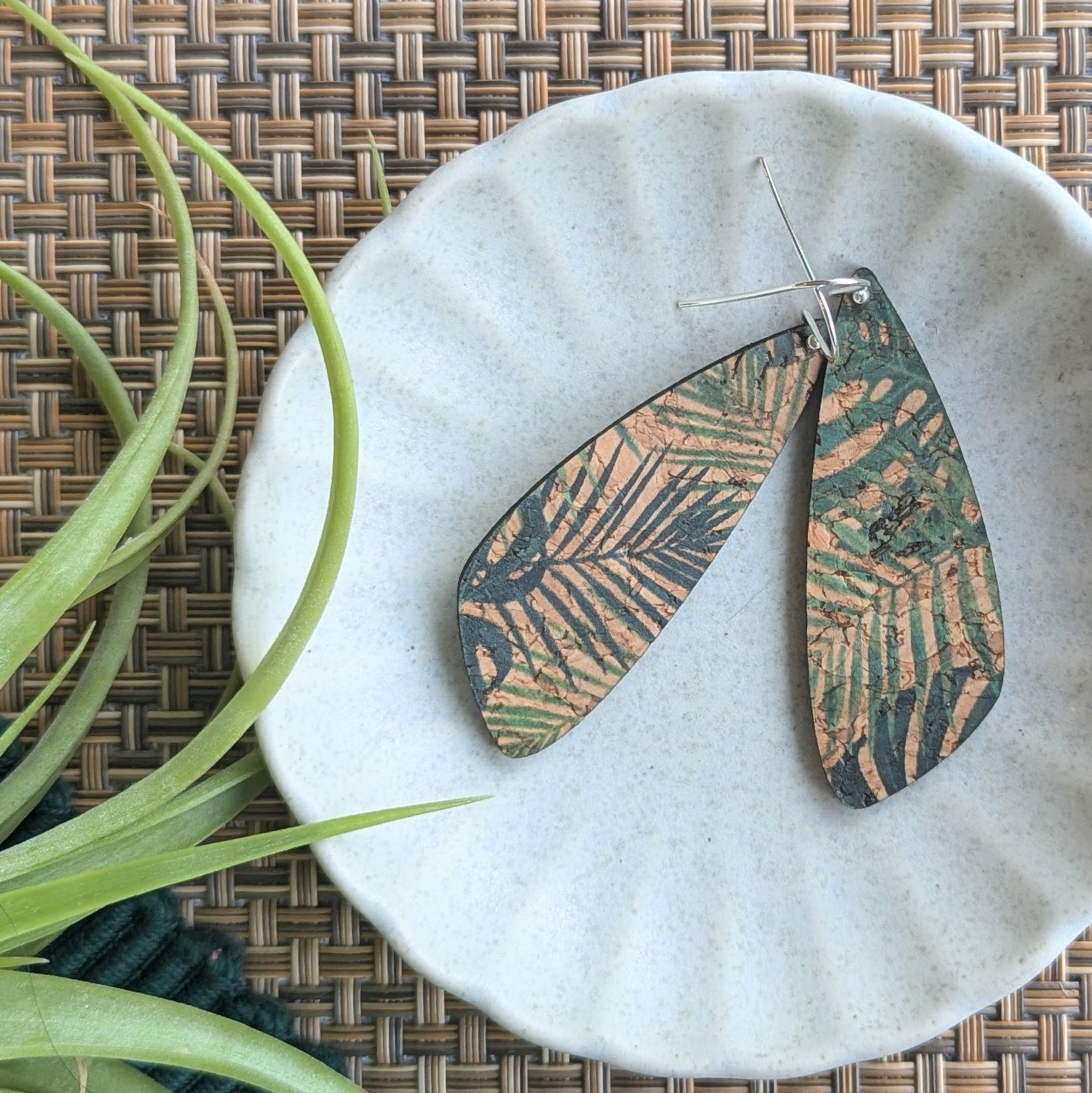 Green and Fuchsia Leaves Cork Earrings - Small Wing