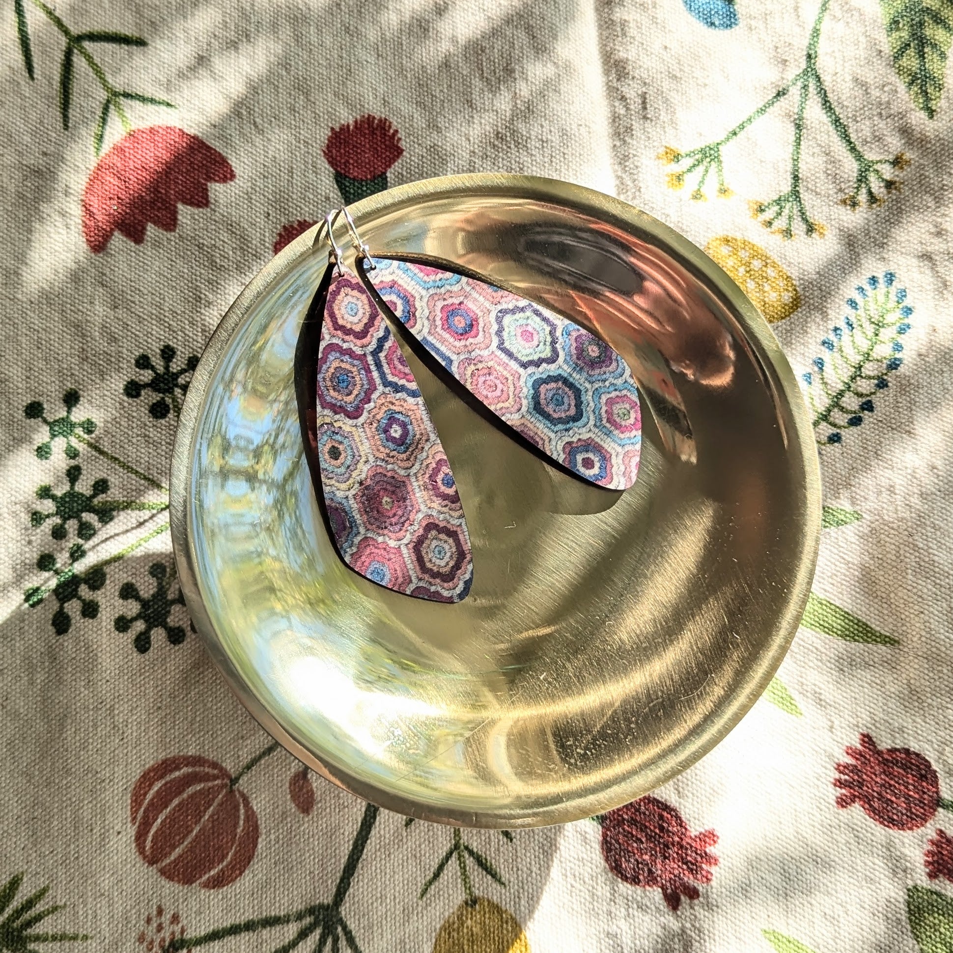 Embroidered Hexagons Cork Earrings - Large Leaf